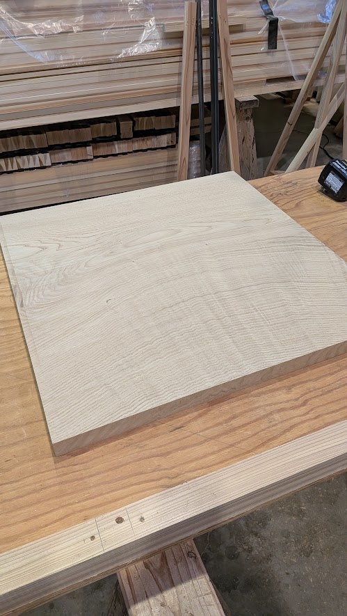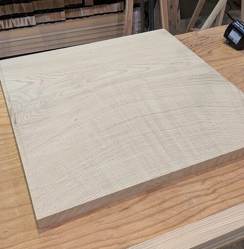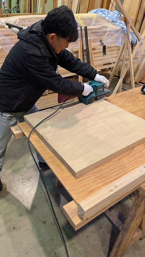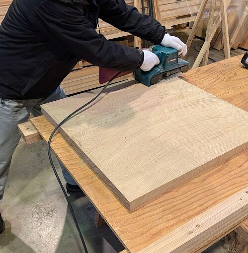 天板と脚に使用したのは、力強い木目と耐久性が特徴の「クリの無垢材」です。 大変貴重な材料ですが、弊社工房には、多様な樹種の無垢材を豊富にストックしております。ダイニングテーブルやカウンター、床板などの大きな部材を切り出す際、どうしても生まれてしまう「短い材料」も、私たちにとっては大切な材料です。 今回は、それらの素材を無駄にすることなく、職人の手で新たな命を吹き込みました。