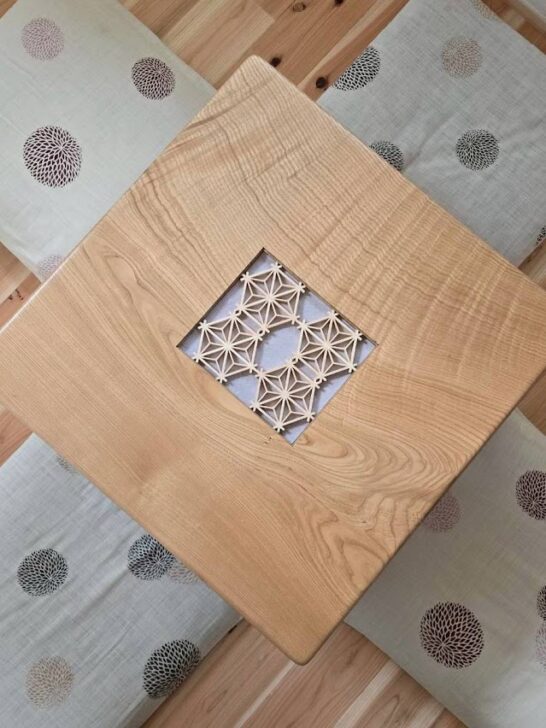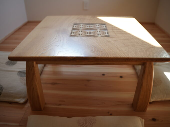 組子(くみこ)を無垢材の天板に美しく組み込み、オリジナルの座卓を製作いたしました。