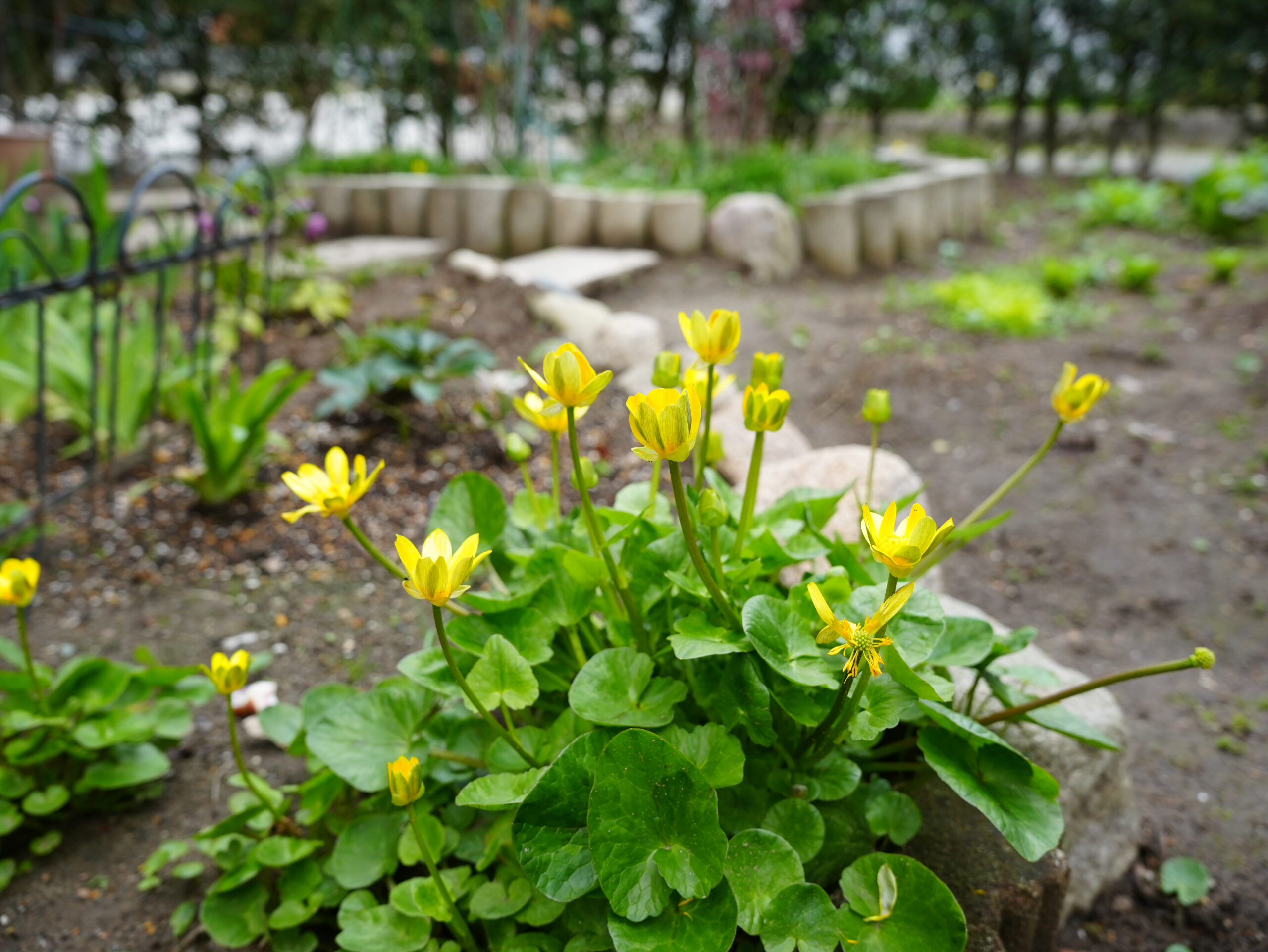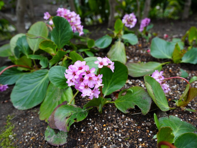 春の訪れとともに、足元には、鮮やかなピンクのヒマラヤユキノシタや、陽だまりのような黄色いリュウキンカ。