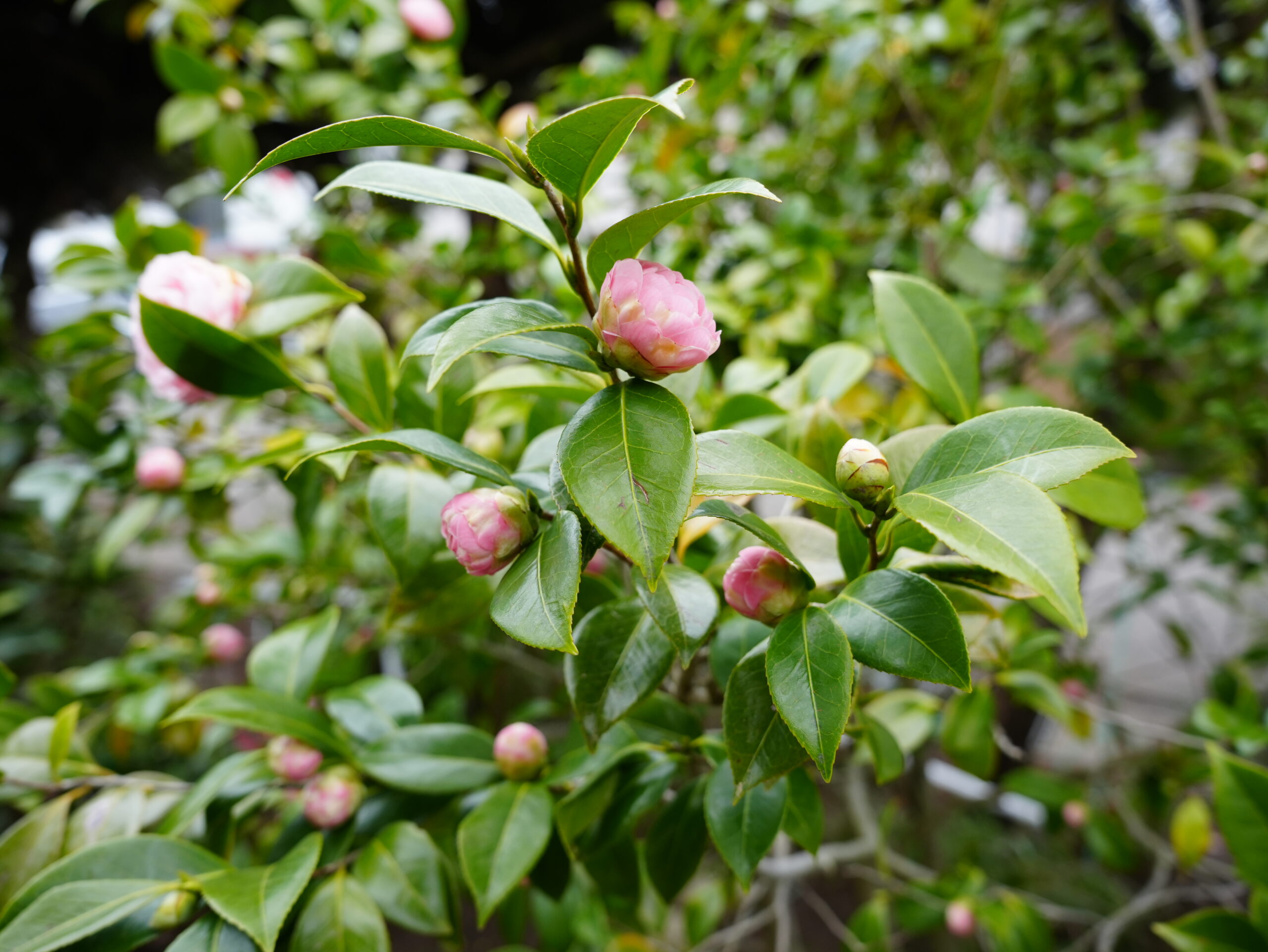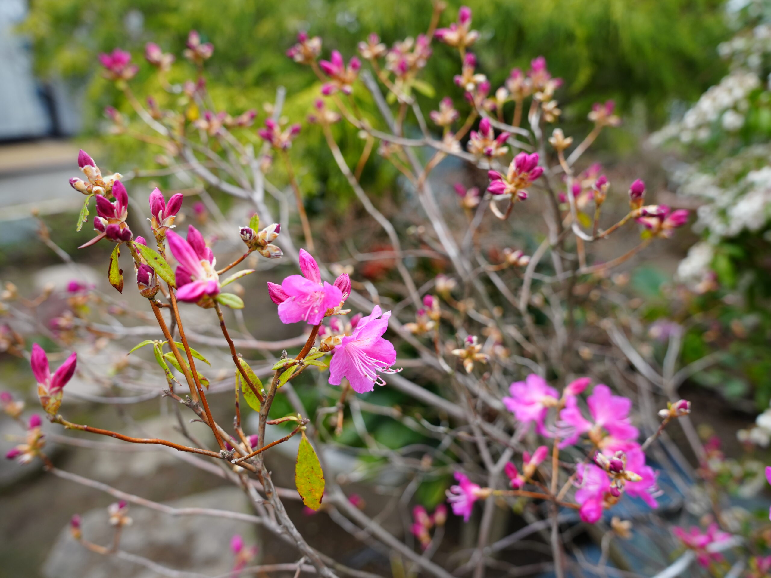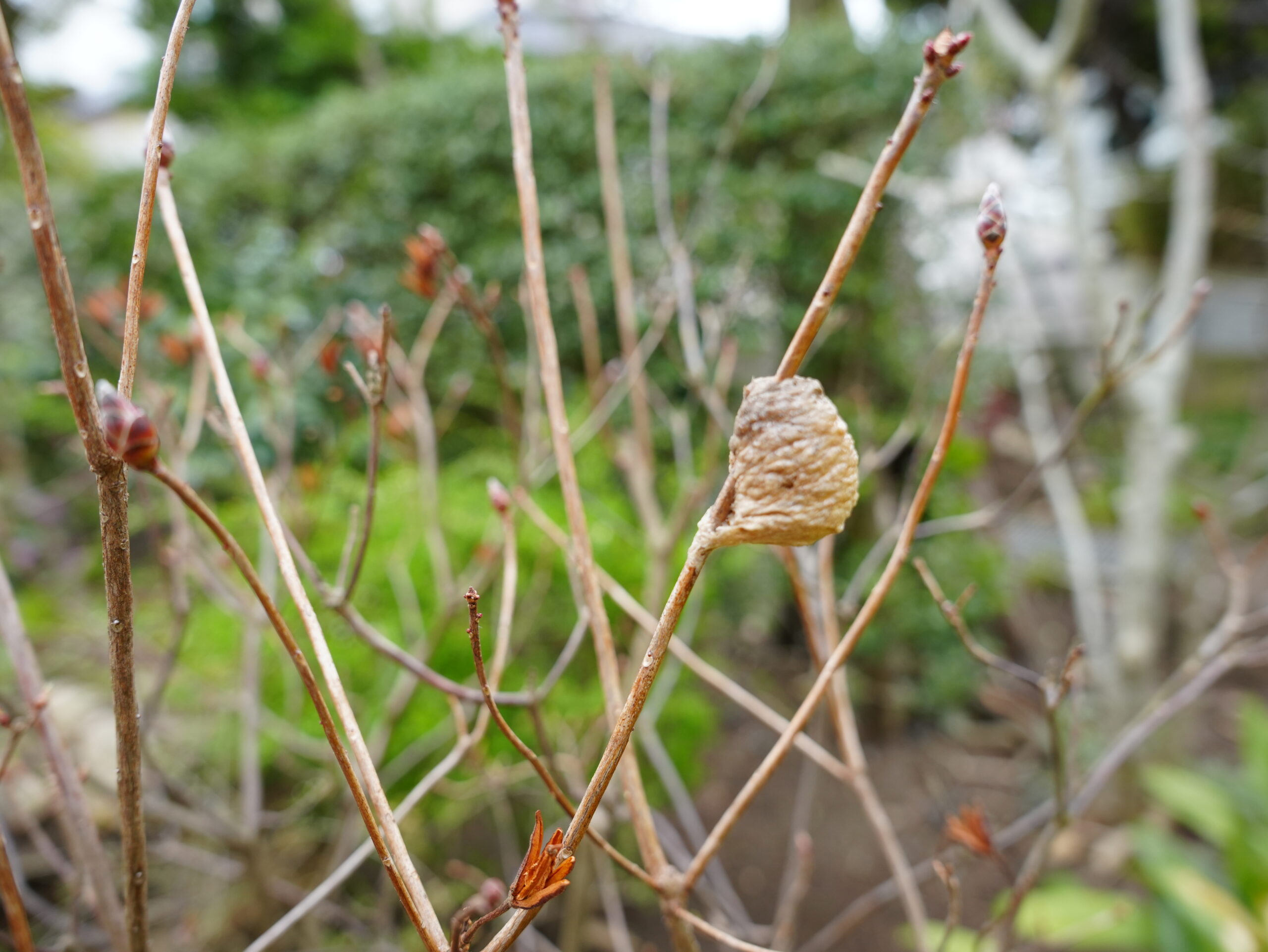 ふと見上げれば、ツツジの蕾が今か今かと開花を待ちわび、枝先には可愛らしいカマキリの卵も見つけました。