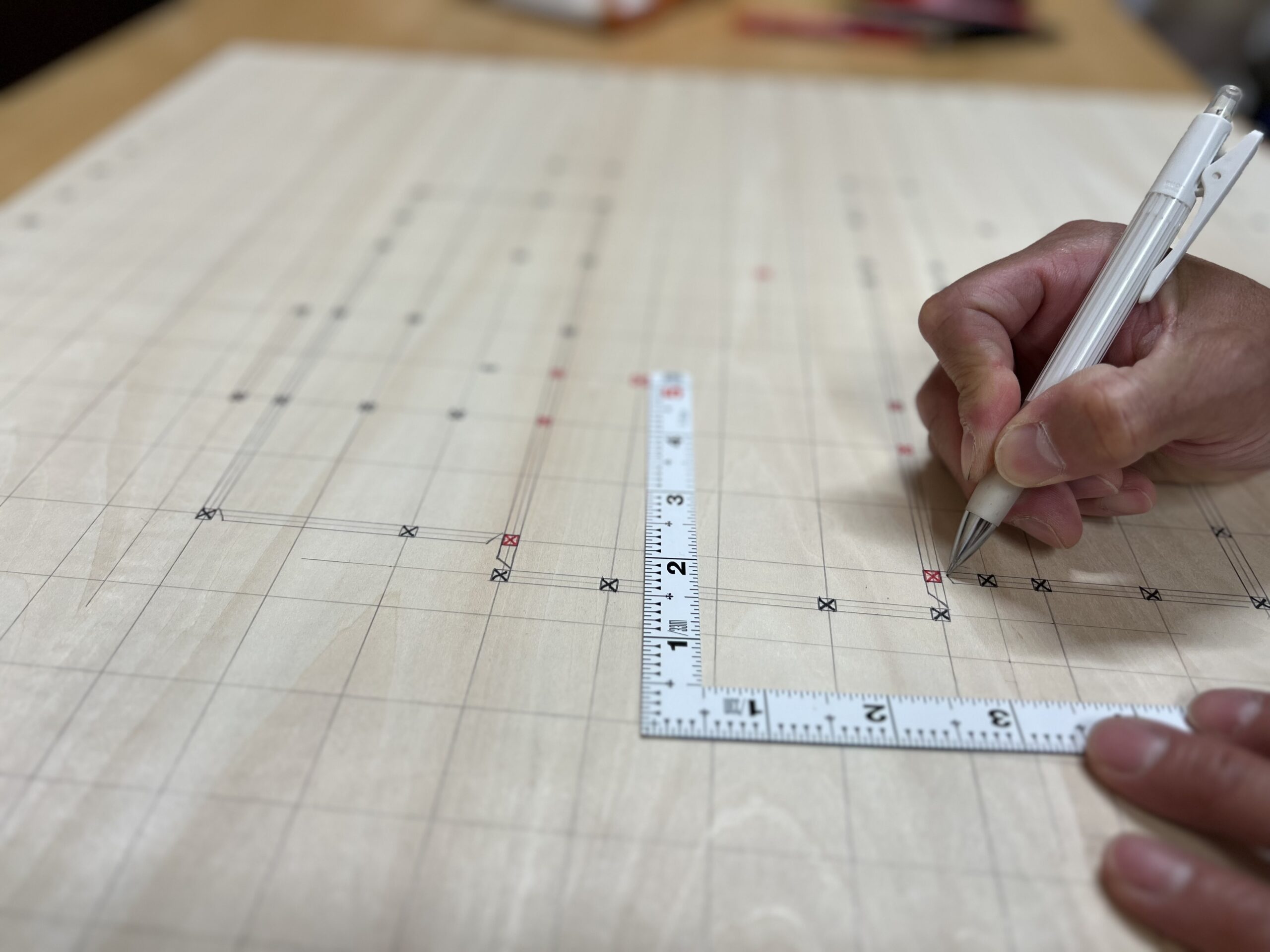 手板には、柱や梁の位置を示すための通り芯(基準線)が記されています。
