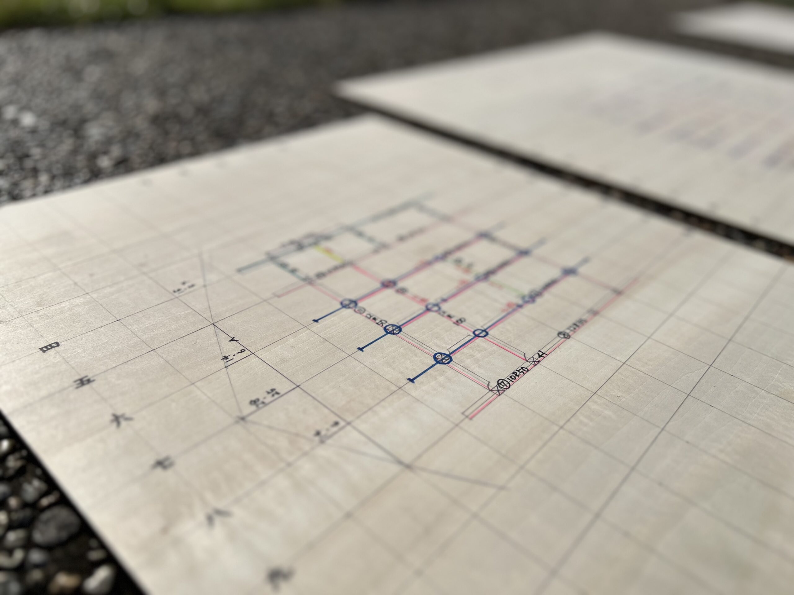 時代は流れ、エクセルが登場すると計算は格段に楽になり、今では専用の構造計算ソフトが図面(伏図)まで自動で描いてくれます。しかし、技術が進歩した現代でも、現場のものづくりにおいて変わらない大切な工程があります。それは、大工が図面から読み取り、「手板」をつくる作業です。
