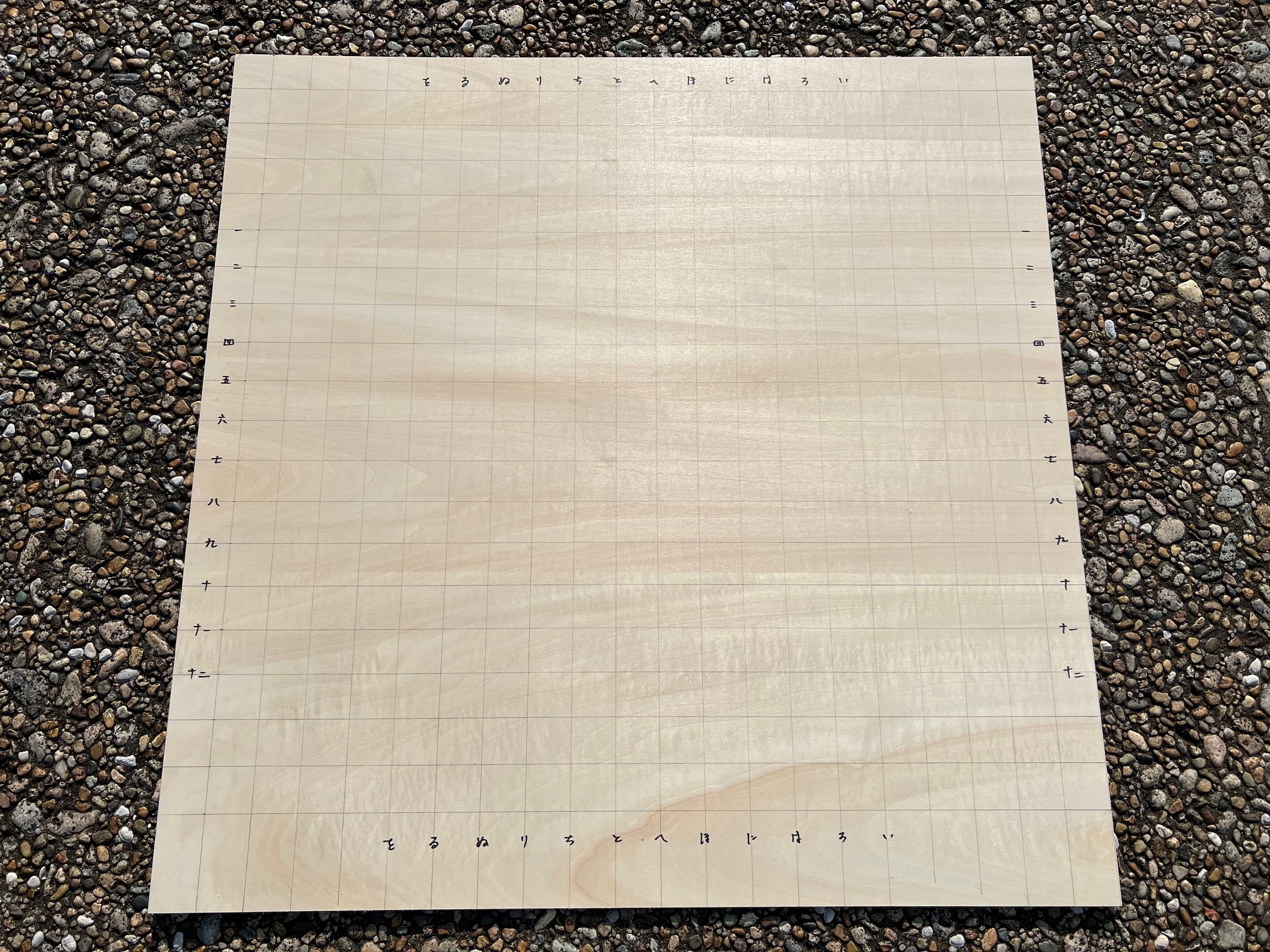 この組み合わせで、柱の位置を特定します。特に基準となるのが、建物の角にある一番最初の角柱の番付が “い“ の ”一番“ です。手板の上で、大工は一本一本の柱の位置、寸法、仕口を、定規と鉛筆で確認しながら描いていきます。