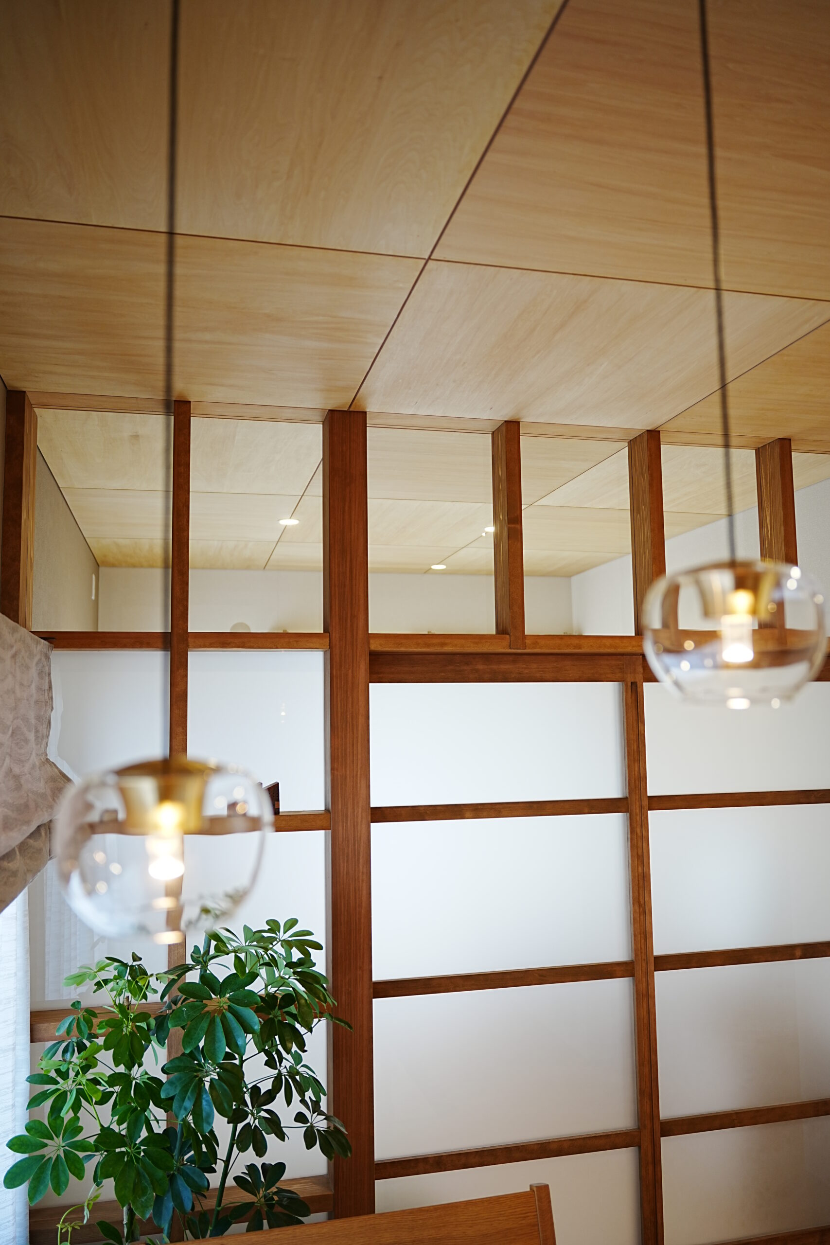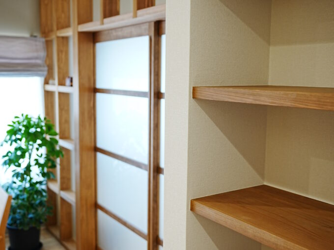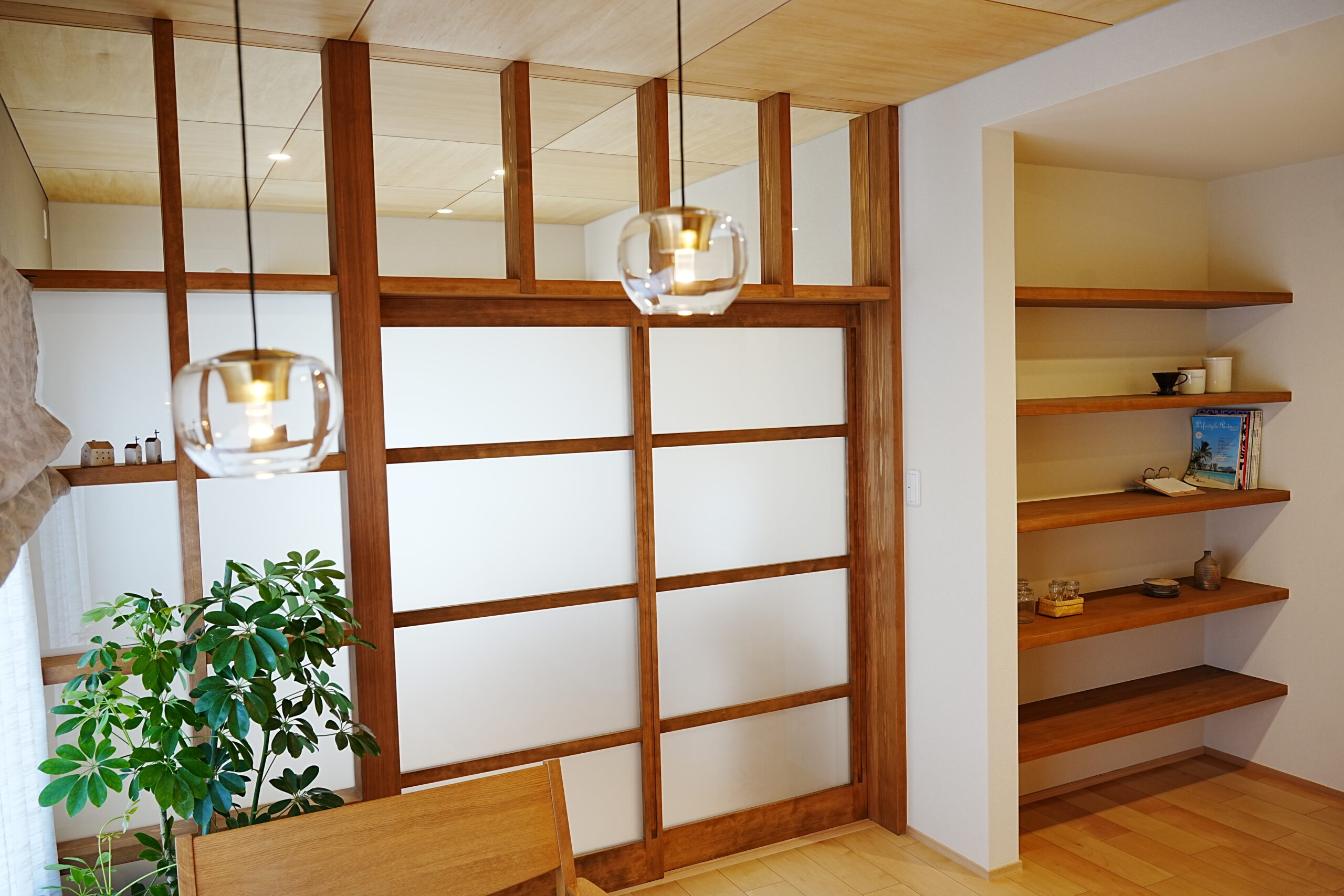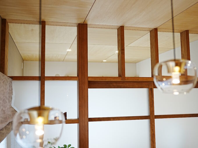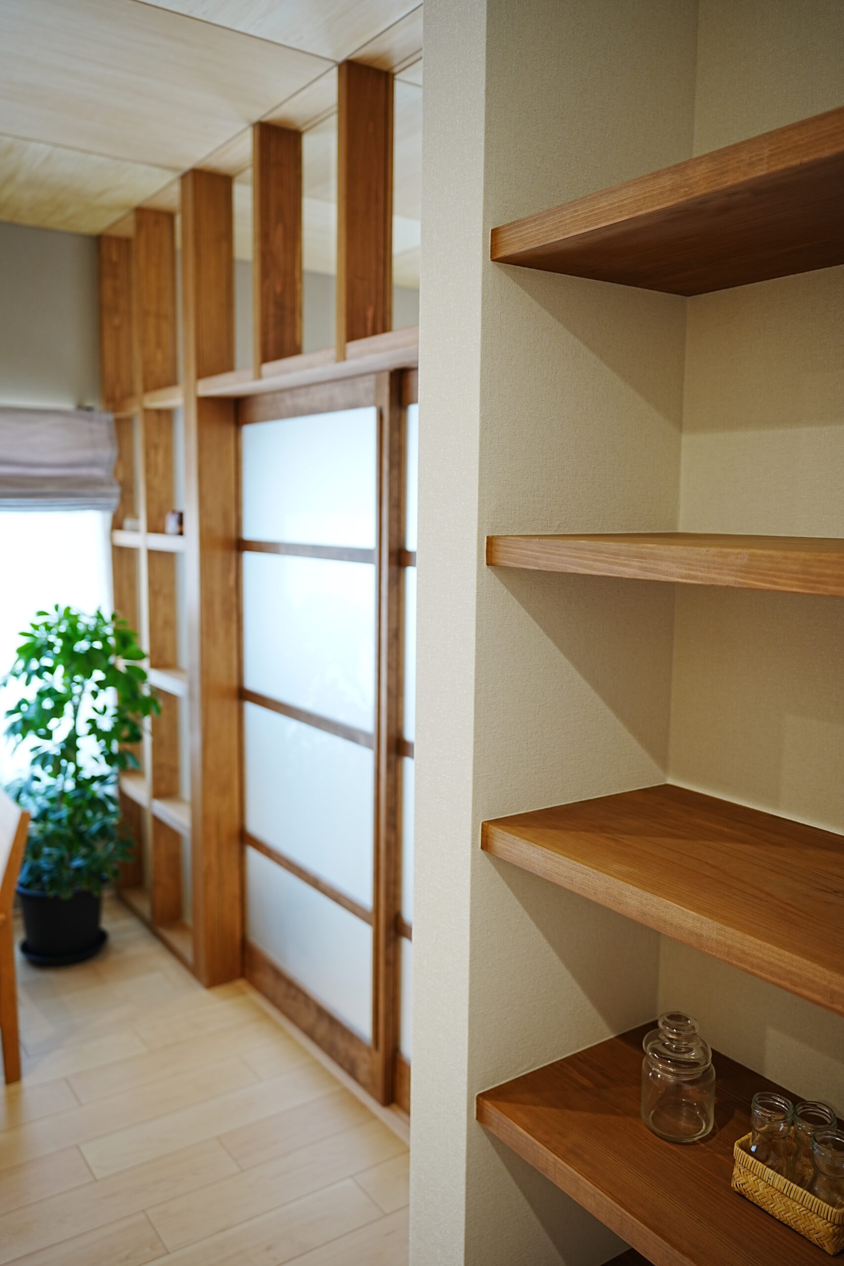 間仕切りの格子には杉の無垢材を使用し、自然塗料で着色することで、味わい深い色合いに仕上げました。隣接する収納棚なども素材の統一感を出すため、同じ杉の無垢材を用いています。