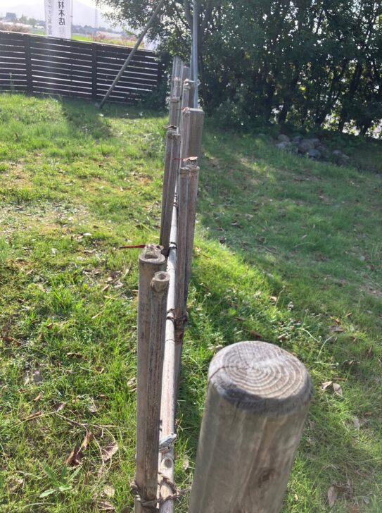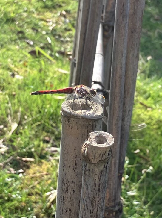規則正しく並んだ竹垣と、その上に整列する赤とんぼたちに心がほっこりする光景でした。