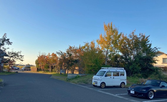 この写真には写りきっていませんが、この駐車場の奥、重川材木店への入り口の向こうには、佐渡島がうっすらと見えています。