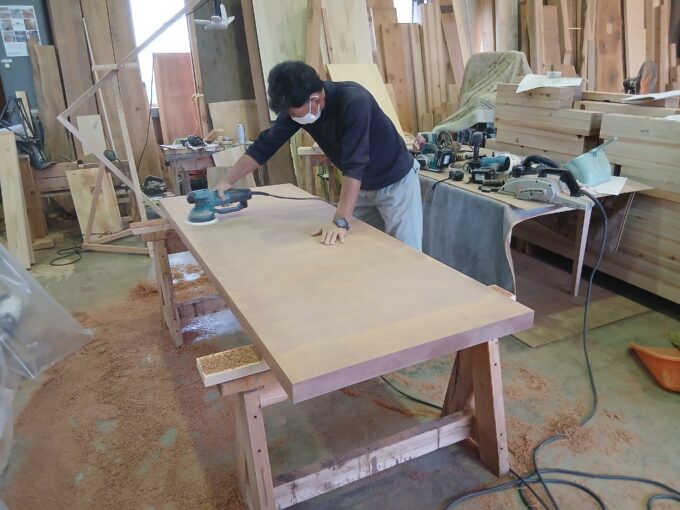 テーブルの主役である天板には、今年の7月頃に自社大工が下準備を整えていた、希少なモアビの一枚板を使用しました。