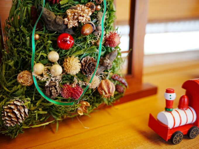 今回製作したクリスマスツリーは、約30cm大のグリーンの土台を使った、壁掛けできるデザイン。松ぼっくりやひしの実、ドライフラワーをちりばめて、オリジナリティあふれる作品を制作しました。