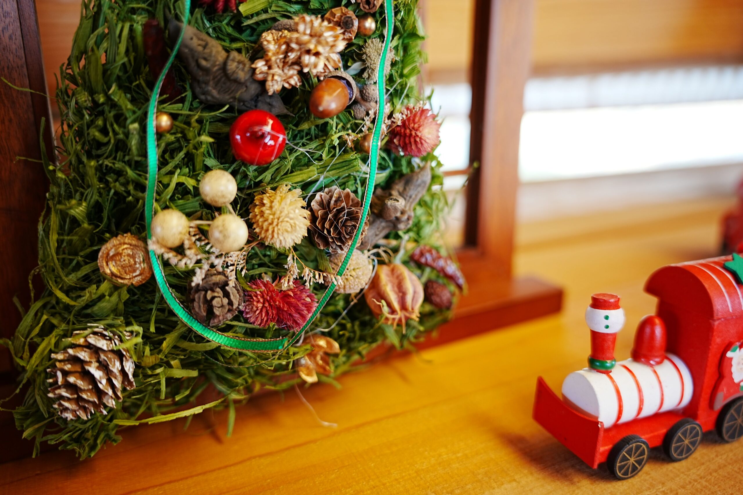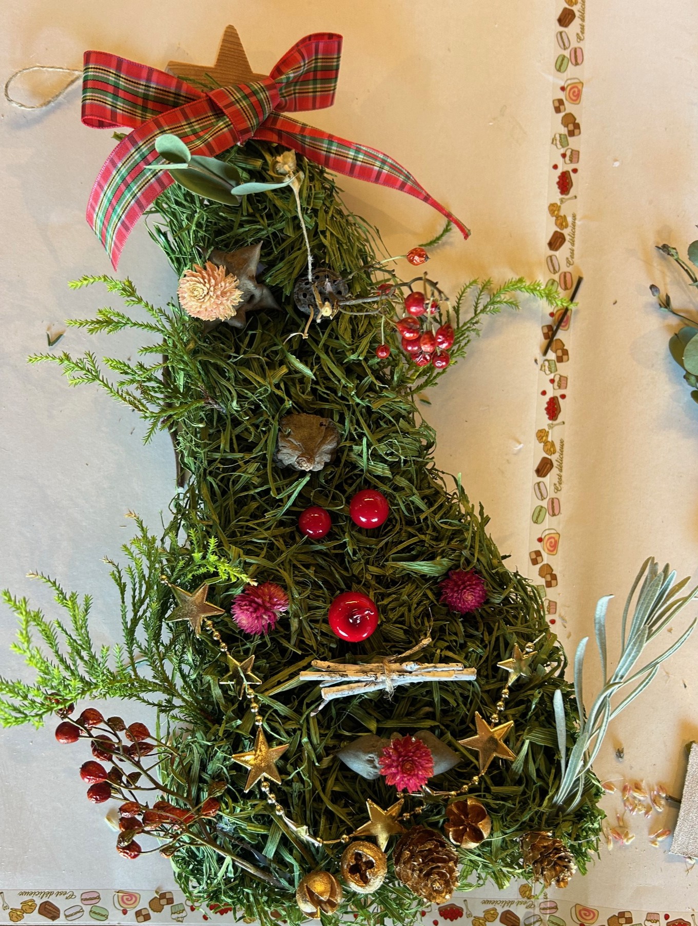 今回製作したクリスマスツリーは、約30cm大のグリーンの土台を使った、壁掛けできるデザイン。松ぼっくりやひしの実、ドライフラワーをちりばめて、オリジナリティあふれる作品を制作しました。