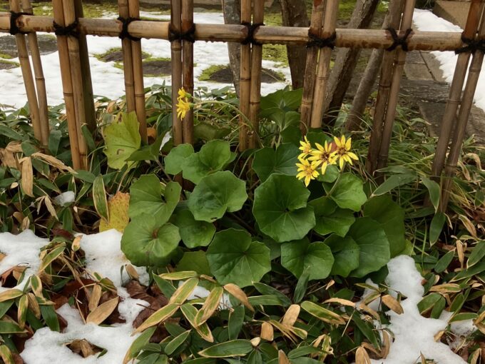 雪の中でも力強く咲くツワブキ(石蕗)の黄色の花。冬の寒さに負けず、鮮やかな葉と花を見せる植物が、庭に温かみと彩りを与えてくれます。
