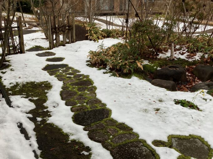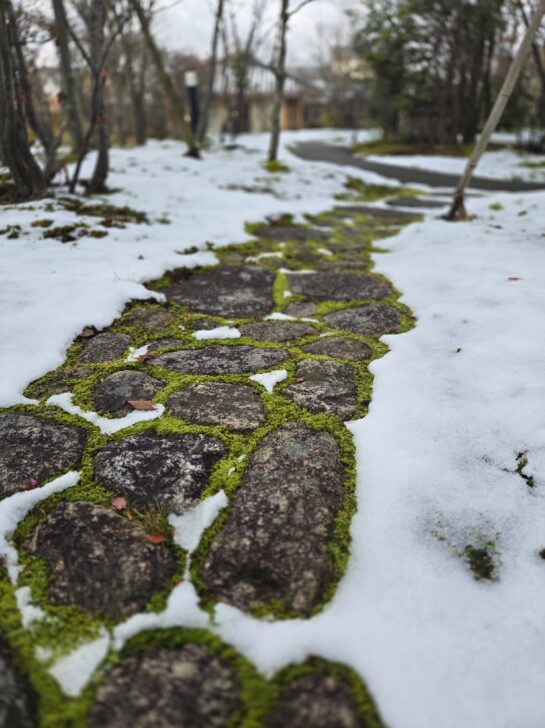 雪が積もる飛び石の周りには、石に沿って鮮やかな苔(コケ)の緑が見えています。この雪と苔が織りなす対比が、なんとも言えない趣を醸し出しています。