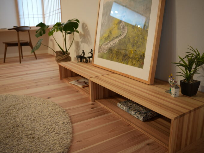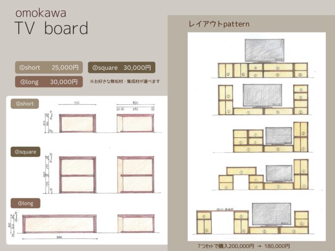 お客様一人ひとりのライフスタイルや住まいへの想いに応えるため、組み合わせパターンで様々なレイアウトが楽しめる「オリジナルTVボード」を製作いたしました。