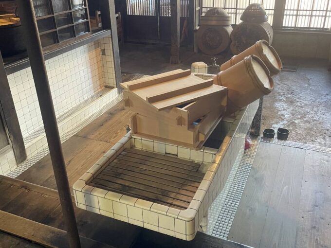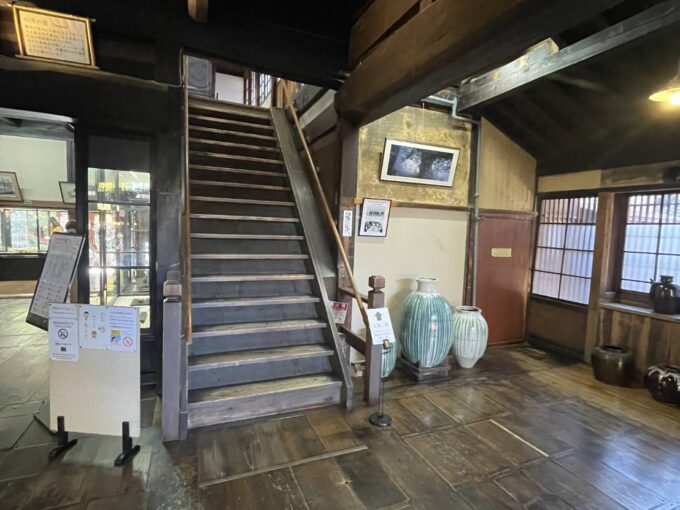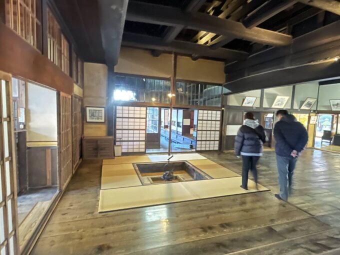 建物の中に入ってまず驚かされるのは、その重厚な造りです。 見上げれば、黒光りするほどに磨き上げられた太く立派な梁が縦横に走り、当時の建築技術の粋を集めたことがうかがえます。