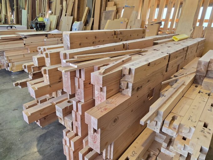 新潟市東区に上棟予定のT様邸。 工房では、大工の手によって丁寧に仕上げられた構造材が、いよいよ出番を待つばかりとなりました。