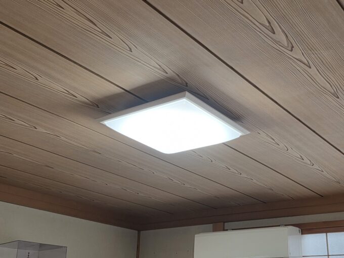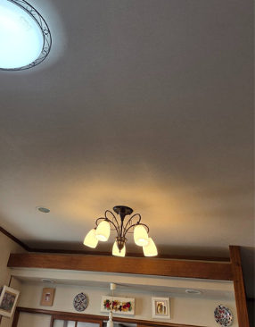 ▪ 照明の位置を動かすと、元の位置に跡が残ってしまいます。そこで今回は、天井クロスの貼り替えもご提案しました。