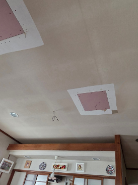 ▪ 照明の位置を動かすと、元の位置に跡が残ってしまいます。そこで今回は、天井クロスの貼り替えもご提案しました。