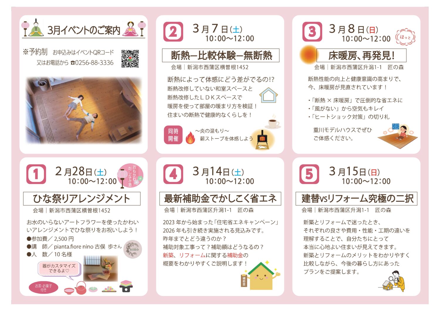 理想の住まいを叶えるためには、ネットの情報だけでなく、「実際の体感」と「最新の専門知識」が不可欠です。今月は、寒さの残るこの時期だからこそ違いがわかる断熱体験から、2026年度の最新補助金セミナーまで、バラエティ豊かな企画をご用意しました。