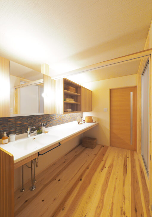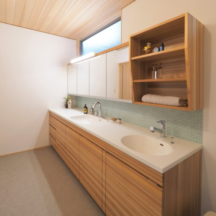 朝の忙しい時間、洗面台の取り合いになりませんか? こちらは贅沢にボウルを2つ並べたワイドな設計。家族が並んで準備ができるだけでなく、木目の美しいカウンターがまるでリゾートホテルのような上質さを演出してくれます。