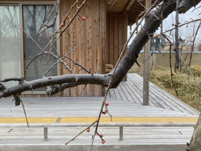 和風棟を囲む生け垣や、自然素材モデルハウスのウッドデッキ前に佇む梅の木。 今、まさに春に向けて芽吹きの準備の真っ最中です。