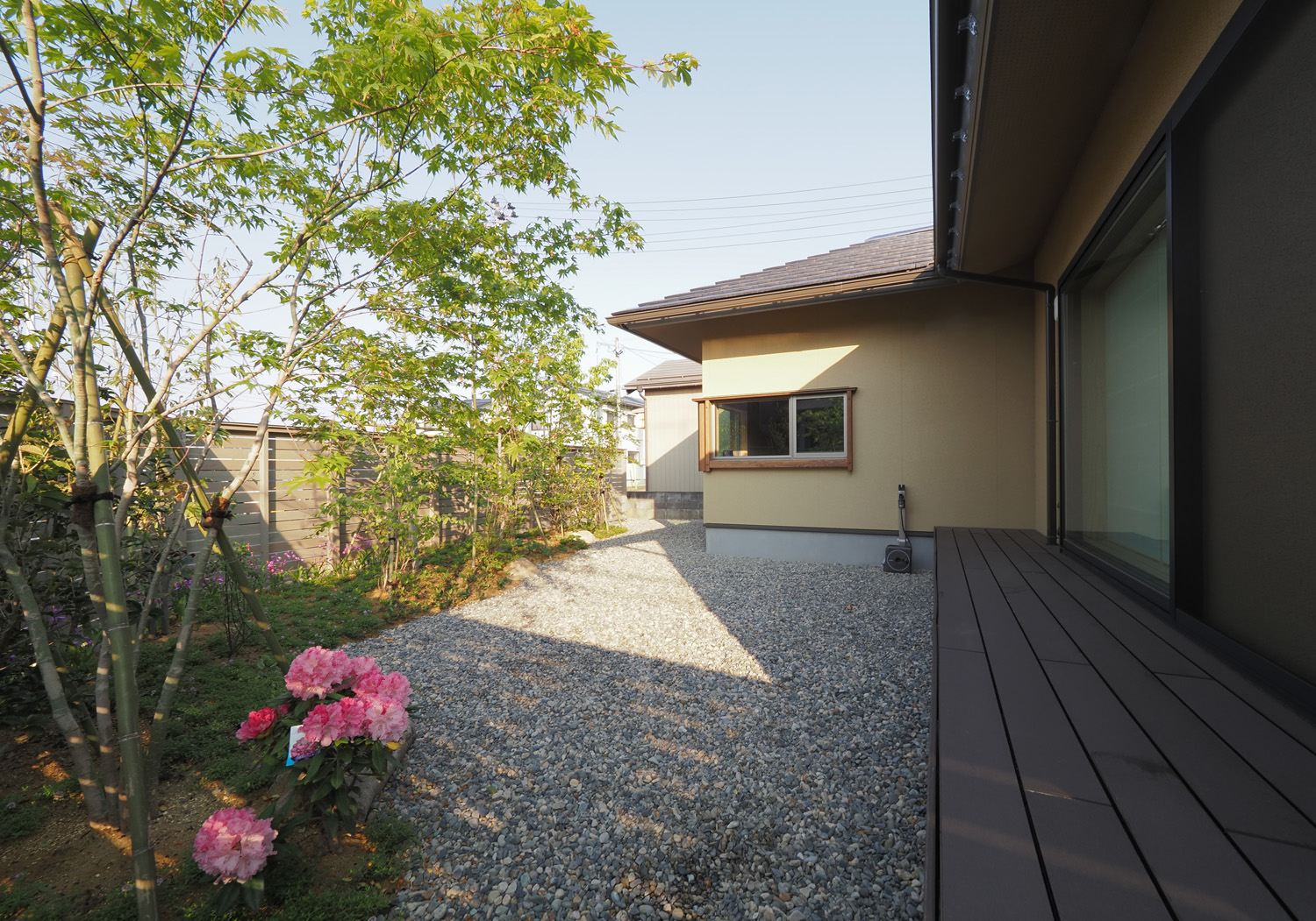 L字型に配置された建物と木塀で囲まれた、プライベートな庭空間