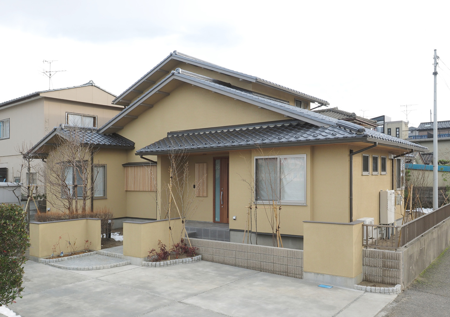 伝統的な美と、シンプルな現代デザインの調和したすっきりとした外観です。大きな切妻屋根が目をひき、落ち着いた色合いの外壁は、周囲の景観に溶け込みつつも、その存在感を際立たせています。