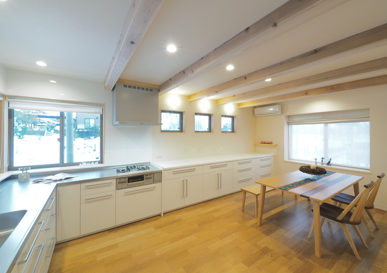 日々の家事や食事の準備、片付けがスムーズに行えるよう、使いやすい作業動線を考慮して設計しました。リビングダイニングから適度な距離感を保ちつつも、オープンな設計で繋がりを感じさせます。