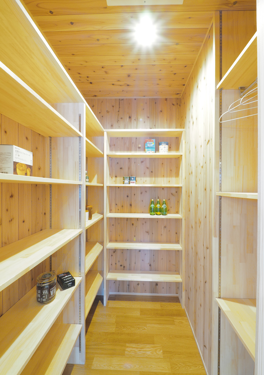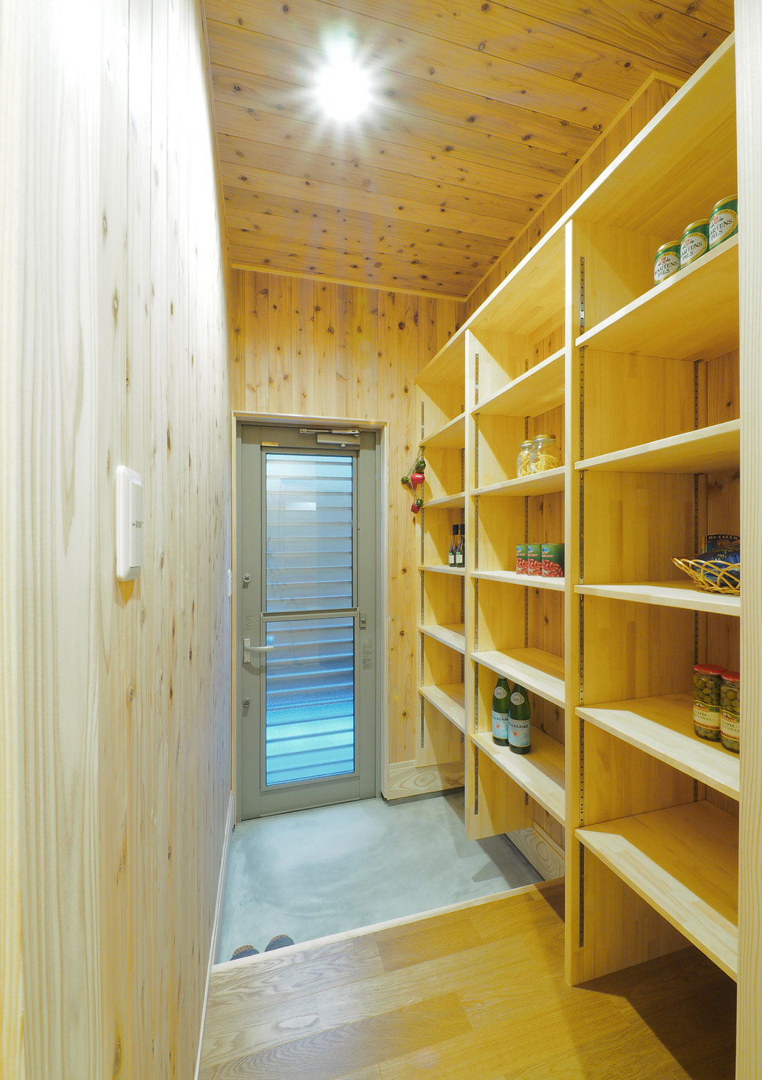 勝手口を兼ね備えた食品庫として設計されており、利便性と収納力を両立した、暮らしを豊かにするスペースです。床面は土間仕上げとなっており、一時的なストックや、汚れやすいものも気兼ねなく置くことが可能です。