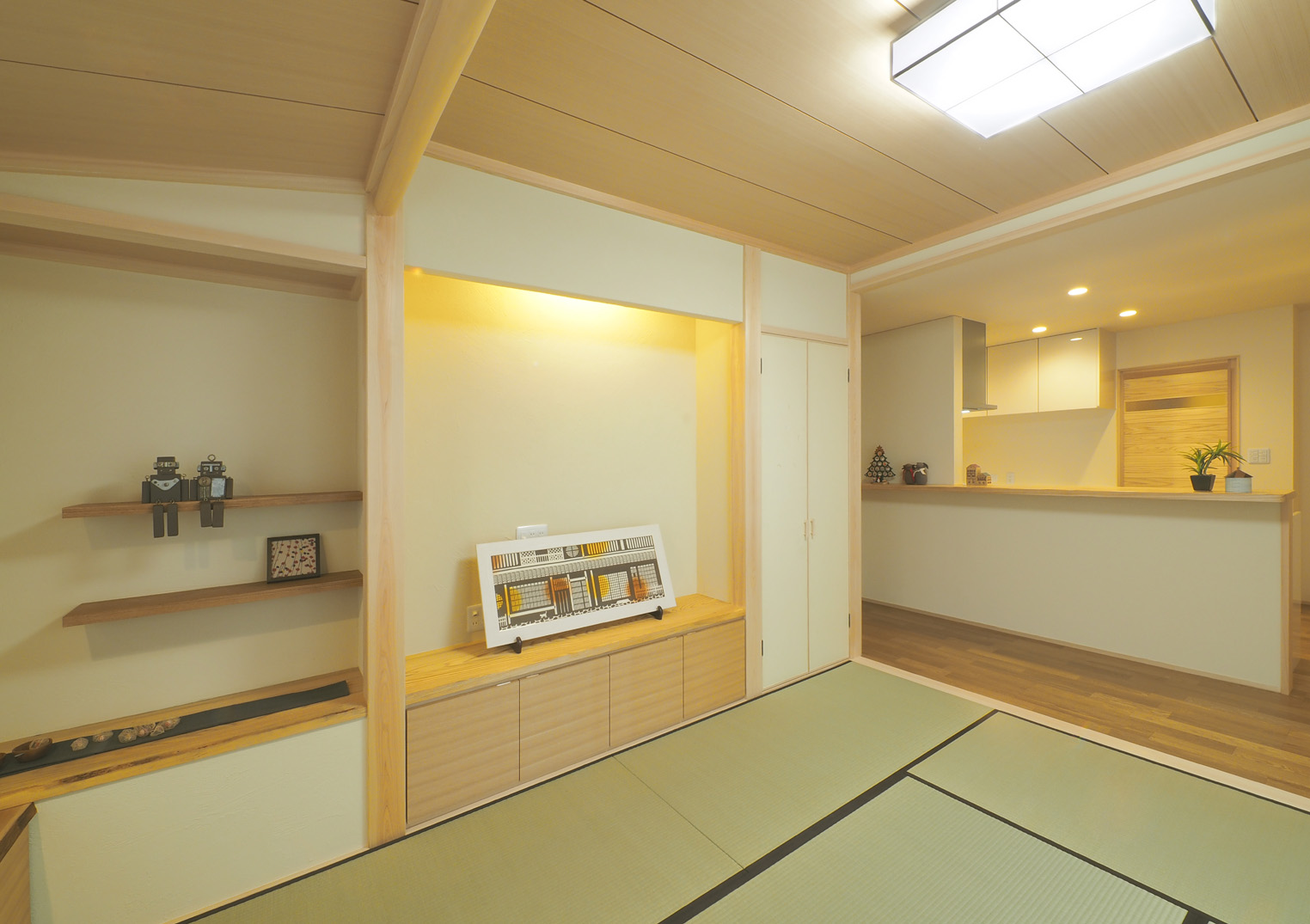 素足に心地よい感触と、どこか懐かしい香りが広がる「座」スタイルの居間空間。家族の気配を感じながらも、それぞれが落ち着ける距離感を保っています。
