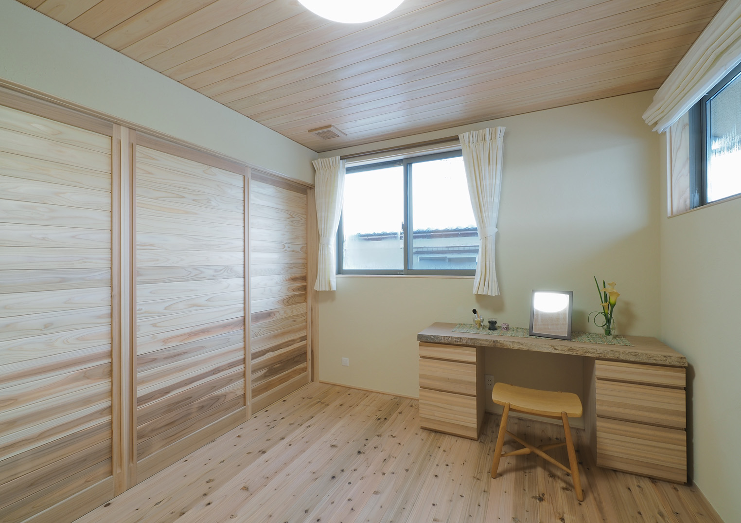杉板が放つほのかな香りは、心地よいリラックス効果をもたらし、お子様の健やかな成長を優しく見守ります。無垢材で造作されたカウンターデスクが設けられており、学習スペースや趣味の作業台として活用できます。木のぬくもりに包まれたこの部屋は、お子様が安心して過ごし、豊かな感性を育むための理想的な空間です。