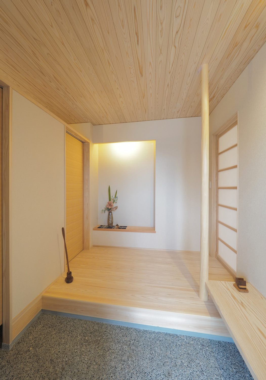 無垢材ベンチが叶える、機能美と上質なおもてなし。 靴の脱ぎ履きはもちろん、重い荷物の一時置きや休憩にも便利なこの場所から、心地よい暮らしのゆとりが始まります。