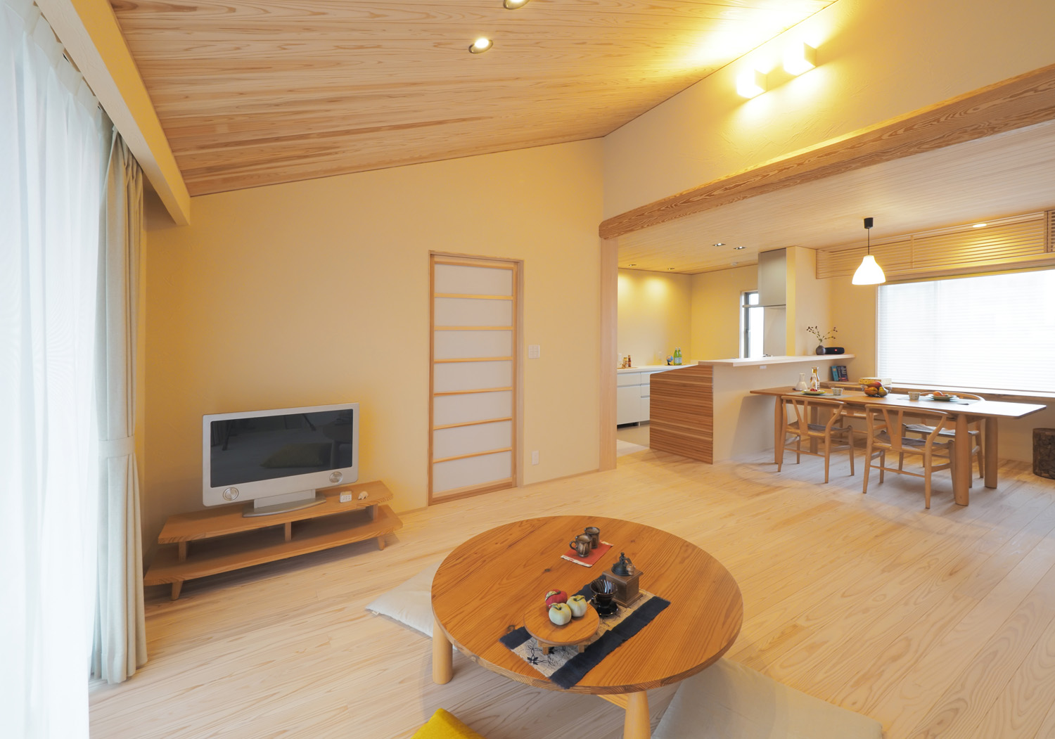 リビング空間は、和室、食堂と一体で計画され、視線が奥まで通る広々とした印象と、風通しの良さを実現。勾配に変化をつけた天井や、自然素材を活かしたインテリアと相まって、実際の広さ以上の心地よさと安らぎをもたらします。