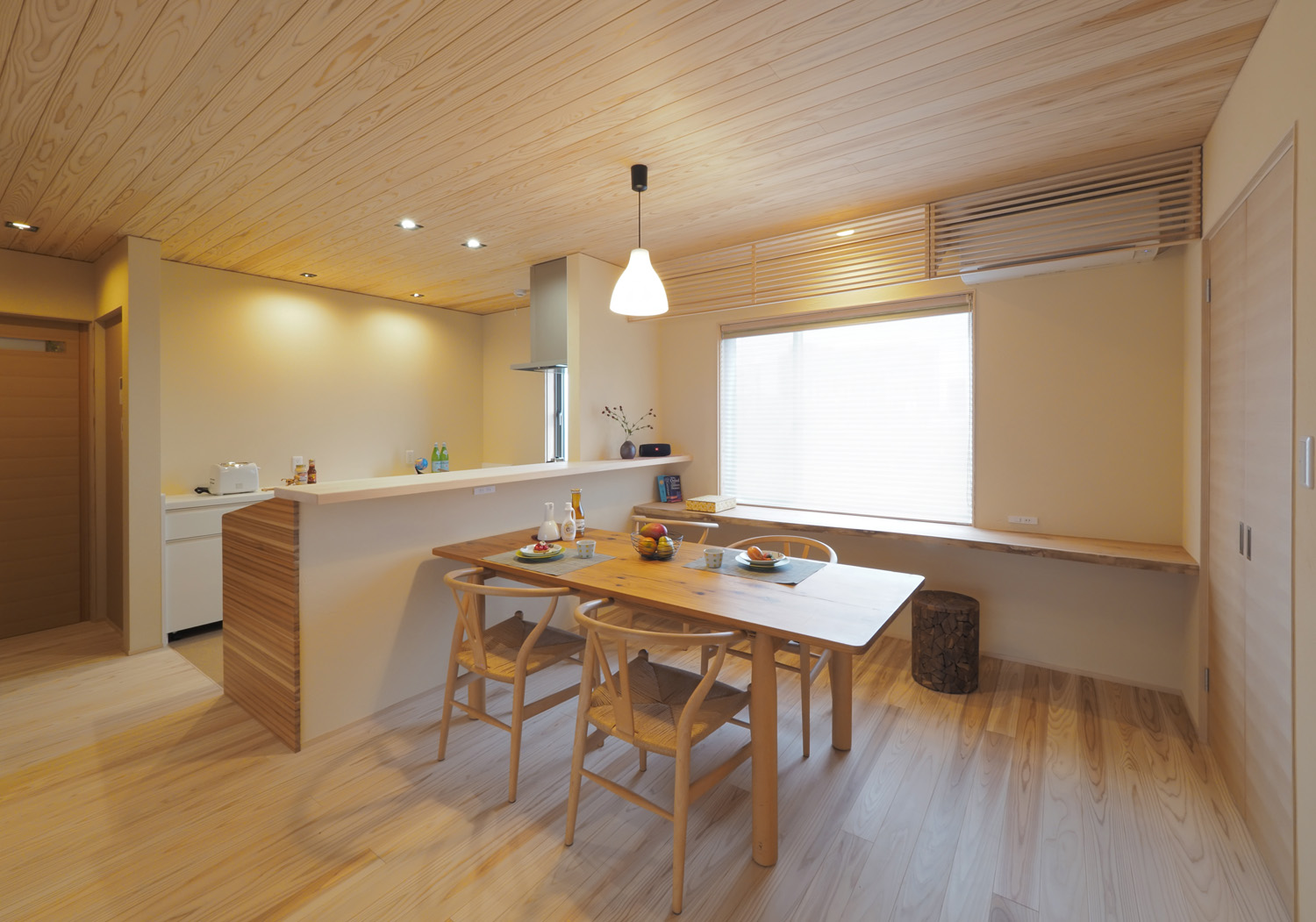 窓際に設けられた無垢板のカウンター。ちょっとした読書や仕事、パソコン作業など、フレキシブルに使えます。ワークスペースとしても活躍します。