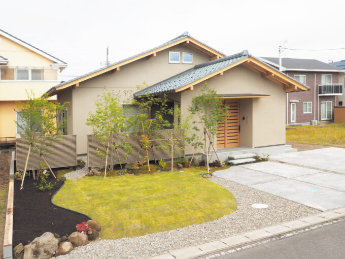 風景に溶け込む、大らかな大屋根の佇まいが、この住まいの顔。その雄大な風格は、優しく街並みに調和します。