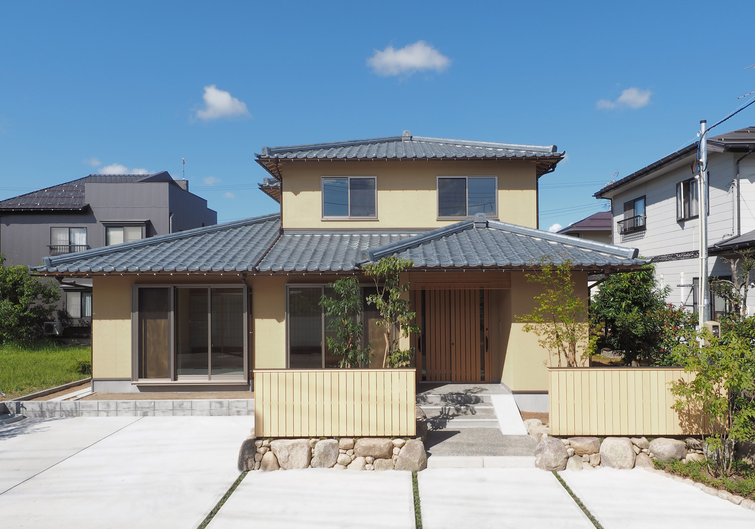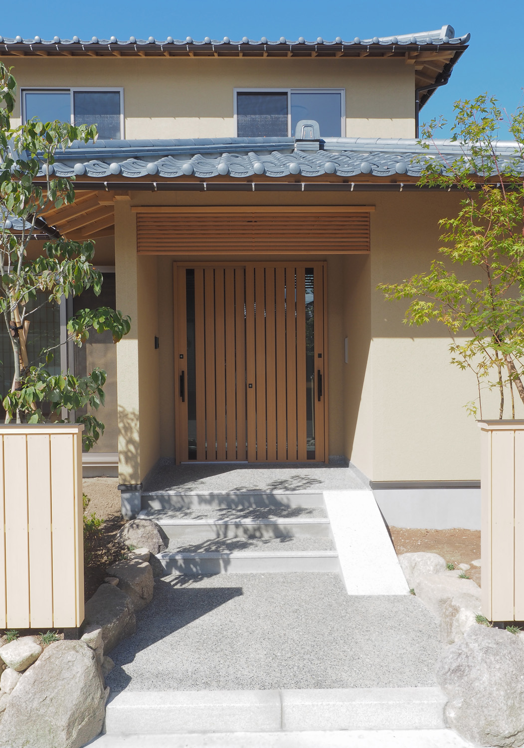 四方へ深く広がる寄棟屋根。その軒の深い影が、建物の質感と風格を高め、重厚な高級感を演出します。足元には自然石を配し、力強いアクセントをプラス。そして、周囲を優しく包む木塀がプライバシーを守りながら、全体を格調高い「和の佇まい」に高めていきます。