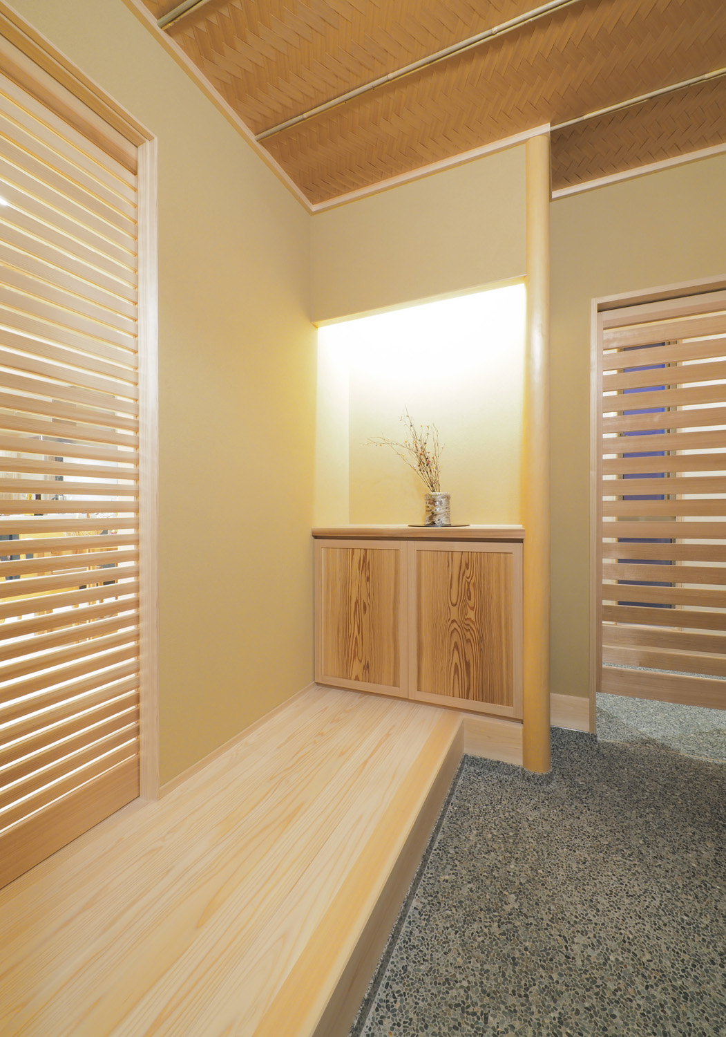 玄関に足を踏み入れると正面には柔らかな光に照らされた飾り棚。季節のしつらえや、お気に入りの小物を飾ることで、住まいの個性をさりげなく表現し、訪れる人の目を楽しませます。間接照明が、空間に奥行きと上品な陰影を添え、落ち着いた雰囲気を醸し出しています。