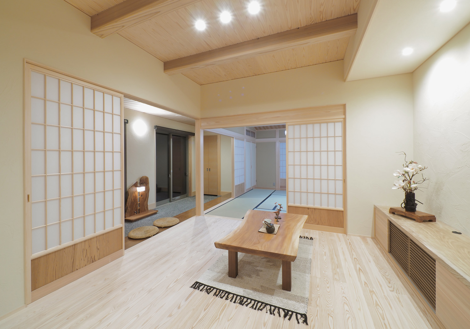 内と外、そして異なる空間がゆるやかに繋がります。障子戸を開け放てば、通り土間や玄関へとスムーズに繋がり、また奥の和室とも繋がり、来客時や親戚が集まる際にも、ゆったりと過ごせる空間に変化します。