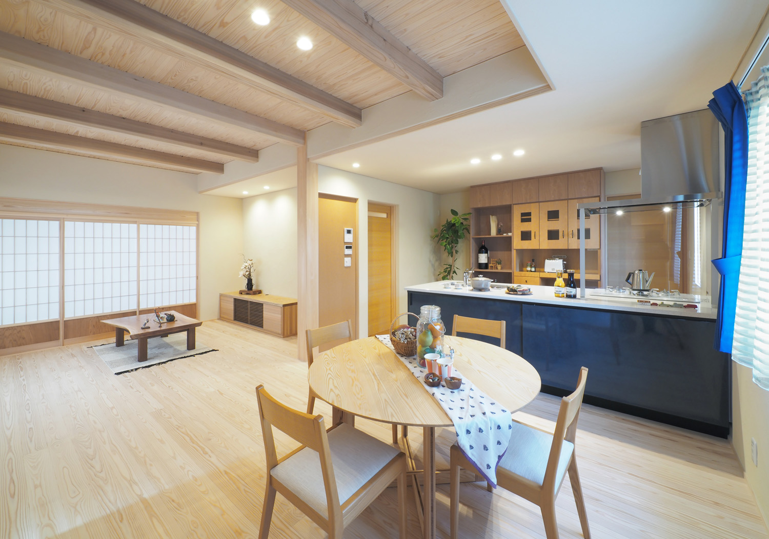 表し梁がデザイン性と広がりを感じるリビングダイニング。お料理中も家族とのコミュニケーションがスムーズに図れるレイアウトです。