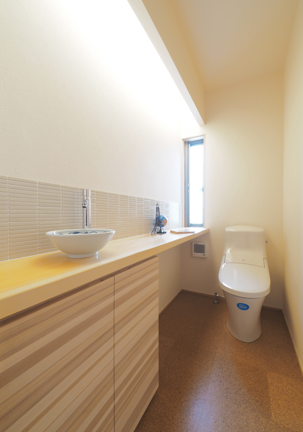 ゆったりとしたサイズの造作洗面、トイレ手洗器は施主様のオリジナルのデザインです。