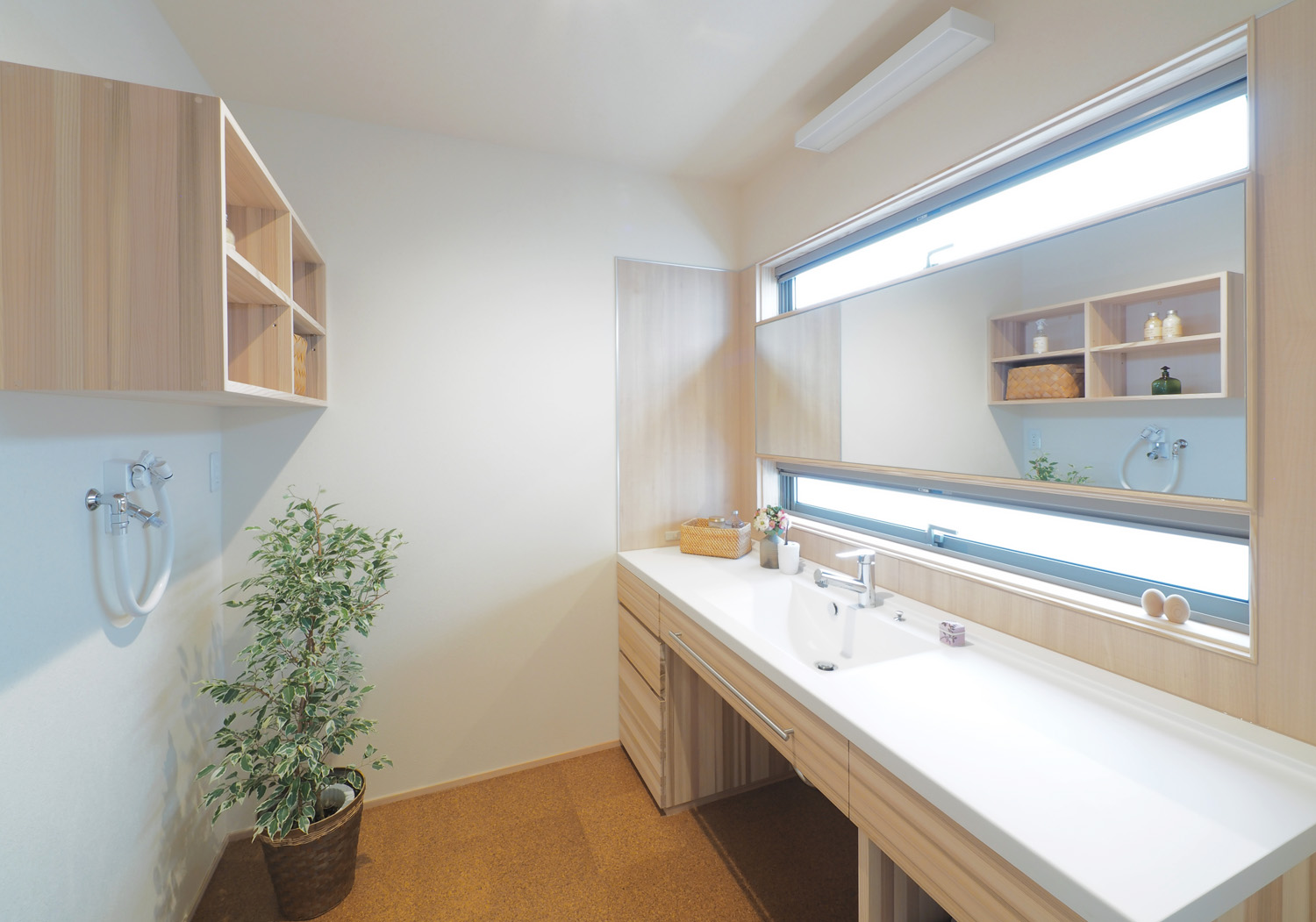 洗面化粧台の鏡の上下に横長のスリット窓が設けられているのが特徴です。これにより、外部からの視線を気にすることなく、効果的に自然光を取り入れることができ、日中の洗面空間を明るく保ちます。また、このスリット窓は、空間にモダンな印象を与えるデザインアクセントとしても機能しています。